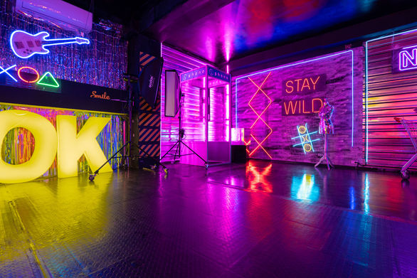 Неонова зала площа котрої 45 м.кв. Безліч неонових вивісок на фактурних стінах (метал, глянець та цегла). Телефона будка, глянцеві куби, візок з супермаркету... Все це та багато іншого створюють контрастний з безліччю відображень простір для креативних та творчих фото та відео зйомок!